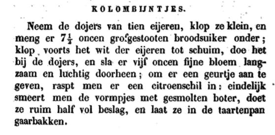 Als je in oude recepten zelfs taarten tegenkomt gemaakt van colombijntjes (zoals we nu ook wel doen met biscuits), dan weet je zeker: hier is iedereen mee bekend. Zelfs in een Haarlemse krant zag ik nog een recept staan, gemaakt van Colombijndeeg. Gek toch? Alsof iedereen maar moest weten hoe je dit deeg moest maken. Trouwens, Colombijntjes waren zelfs zo populair dat er een Colombijnenclub bestond (de club werd vermeld in het officiële orgaan van de Banketbakkersvereniging in 1937).
